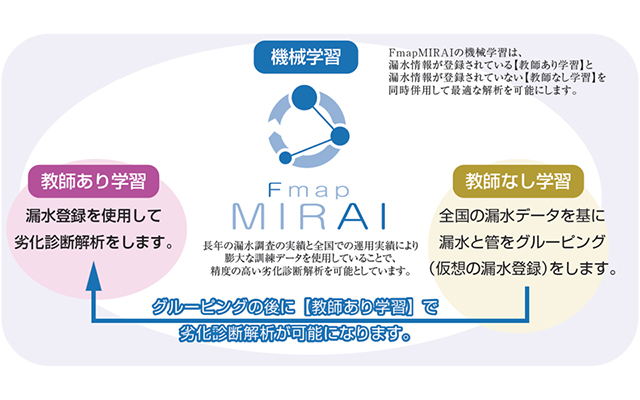 過去の修繕履歴、事故履歴をAIの学習データとし、将来の管路の劣化度合いを数値化します。