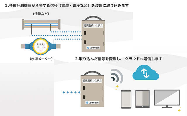 各種計測機器から発する信号を装置に取り込みます。取り込んだ信号をクラウドへ送信します。