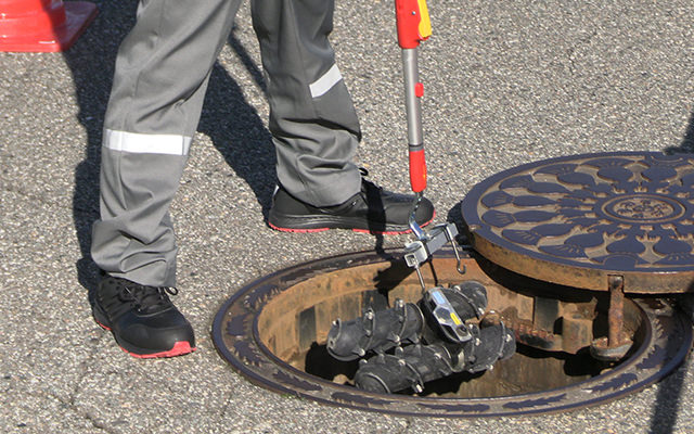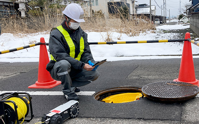 汚水管等からの溢水や宅内への逆流など、雨天時浸入水の原因となる不明水を調査する業務です。