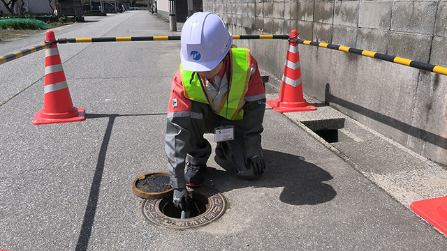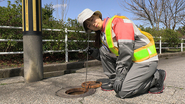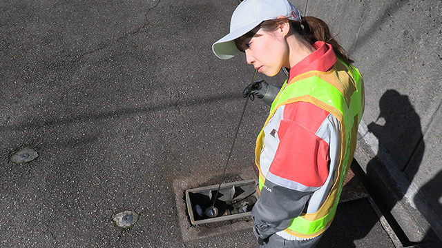 簡易音聴棒を使用し、公道上の弁栓に伝達する漏水音を聴音し、漏水の有無を判定する調査です。