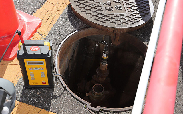 水素式漏水探索機を使用します。水素ガスと窒素ガスの混合ガスを管路内に注入し、漏水箇所から排出される混合ガスを地表面で探査することによって漏水箇所を発見します。