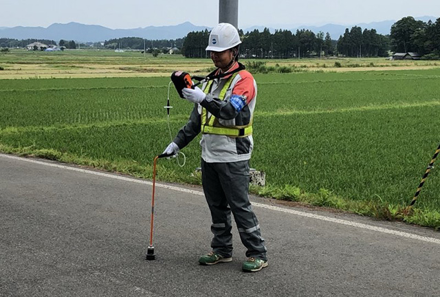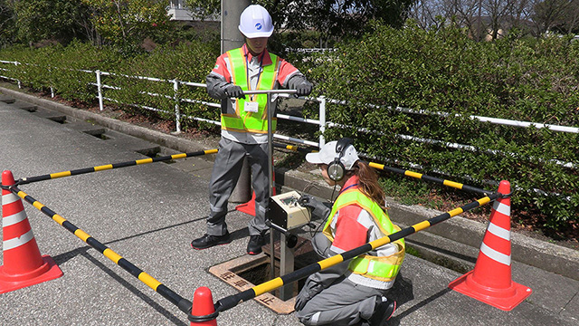 漏水探知器を使用し、路面や弁栓に伝達する音を聴音することで、漏水の有無を判別する調査です。